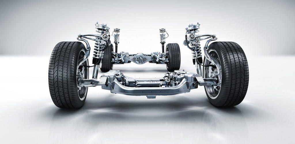 Sistema de suspensión Mac Pherson, incluyendo: cojinete de torre, brazo de control superior e inferior, topes de suspensión, eje de brazo de suspensión, soporte de barra estabilizadora y bujes, rótulas, guardapolvos, punta de eje (vástago), cojinete de ruedas y retenes, barra estabilizadora, eslabones/pernos, soportes y bujes, tensor de suspensión delantera y válvula compensadora caliper, calibrador trasero, tubería y piezas de ensamble, maza de ruedas, resortes, seguros y retenes, auto ajustador, articulaciones y chicotes de freno de